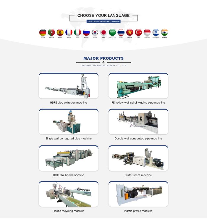 Imamo tudi številne izdelke, kot so linija za proizvodnjo PE cevi, proizvodna linija PVC cevi, proizvodna linija profila, proizvodna linija granulacije, linija proizvodnje pločevine itd. Izbirate lahko med različnimi izdelki.